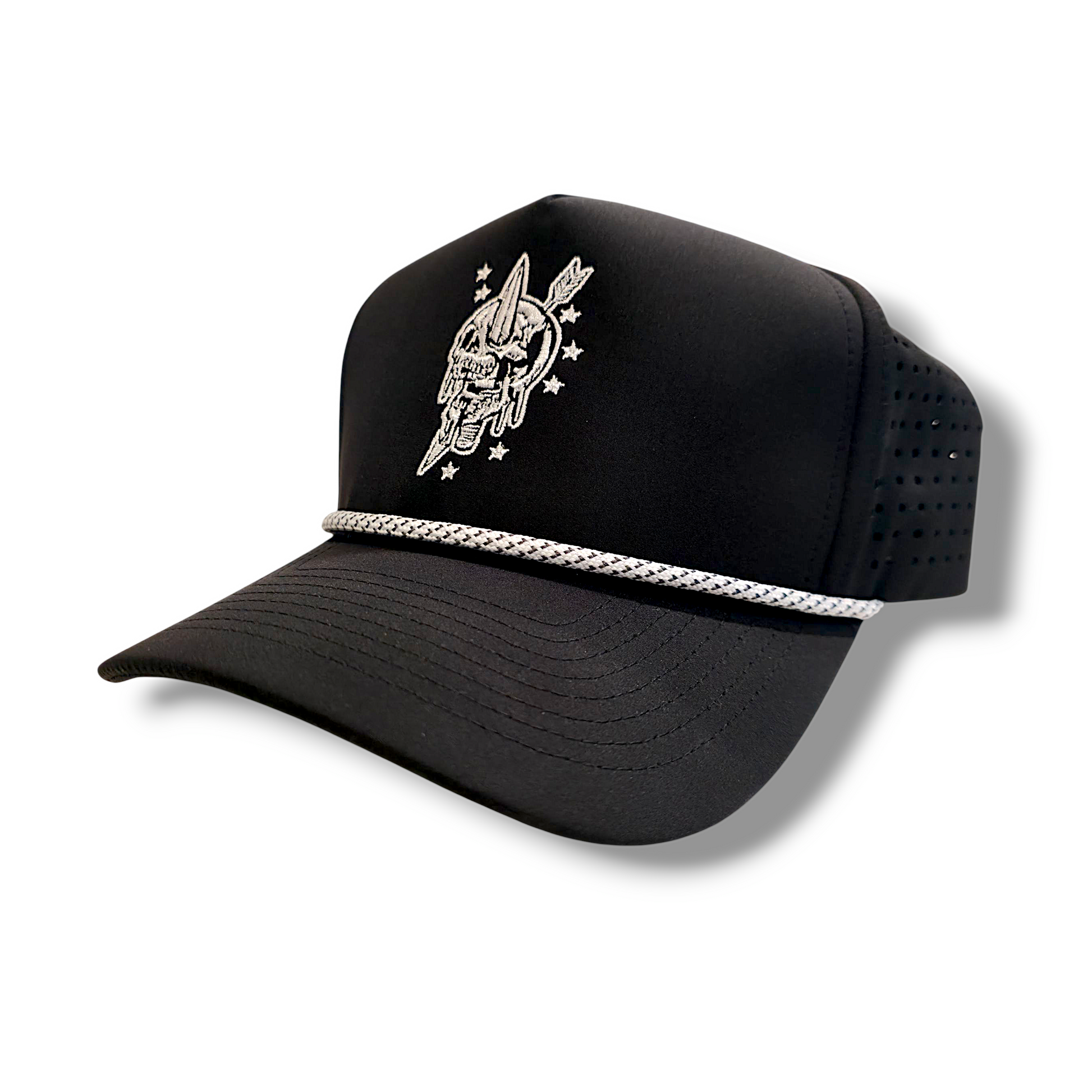 The front panel features a stitched warhead-through-skull design surrounded by stars—an homage to the warriors who strike hard and vanish just as fast. The structured front holds shape without that flimsy foam garbage, while the perforated side panels provide max airflow. A contrast rope accent adds just enough edge without trying too hard.